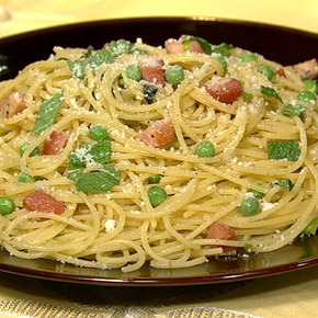 Drain the pasta into a colander and add it to the pea mixture. Add the mint and toss over medium heat for about 30 seconds, until the pasta is nicely coated. Pour into a warmed serving bowl and serve immediately, with the grated cheese on the side.
