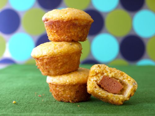 6. Lay turkey dog slice cut side down in the center of each batter-filled muffin cup.
