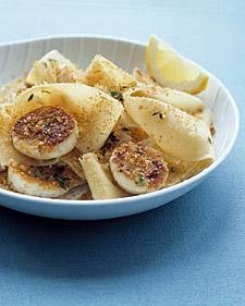 Toss sauce with pasta. Top with scallops and breadcrumbs. Garnish with lemon wedges and thyme.