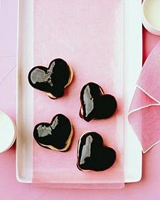 To assemble: Spoon glaze over tops of hearts. Let stand until set, about 10 minutes. Meanwhile, spread filling onto cut sides of bottoms of hearts. Sandwich tops and bottoms. Serve immediately, or refrigerate, uncovered, up to 4 hours.
