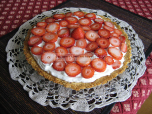 The day you want to serve, place crust on flat cake plate. Whip cream with a splash of vanilla and sweetener of your choice (I like coconut or vanilla DaVinci sugar free syrup). I always add a dusting of glucomannan powder to my whipped cream when I need it to “firm it up” for things like this, but this is not absolutely necessary if you don’t have any. Spread whipped cream evenly over coconut crust and top with raspberries, sliced strawberries or if on the fruit rung of OWL, this is good with thinly sliced peaches. Chill for an hour and then cut into 8 wedges and serve.