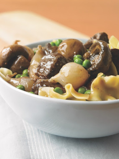 Set the slow cooker to high and cook for 4 hours, until the beef is tender and falls apart with pressure from a fork. In the last 30 minutes of cooking, add the pearl onions and mushrooms. Right before serving, add the peas and simmer for a few minutes to cook through. Discard the bay leaves.