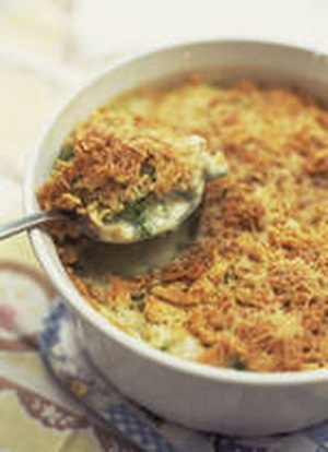• 1 1/2 cups soft bread crumbs tossed with 3 tablespoons melted butter