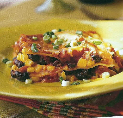 2) Combine first 4 ingredients; spread 2/3 cup sauce in bottom of an 8 inch square baking dish coated with cooking spray. Arrange 2 noodles over sauce; top with 1/2 cup corn and half of beans. sprinkle with 1/2 cup cheese; top with 2/3 cup sauce. Repeat layers once; top with remaining 2 noodles. Spread remaining sauce over noodles. Sprinkle with remaining 1 cup cheese. Cover and bake at 450 degrees for 30 minutes or until noodles are tender. Let stand 15 minutes. sprinkle with the green onions.