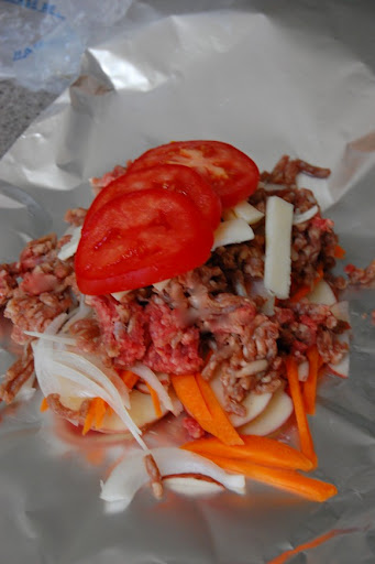 Stack of veggies and beef on foil before baking