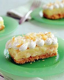 The custard-filled crust can be refrigerated for up to two days. Wait until just before serving to cut the dessert into bars; if crumbs and filling stick to the knife, wipe the blade clean between slices. Then decorate each bar with whipped cream. If you don't have a pastry bag, use a re-sealable plastic bag with a corner cut off.