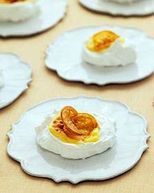 To serve, mound 2 tablespoons lemon curd in center of each meringue, and top with 3 strained candied lemon slices.