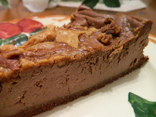SWIRL TOPPING: In small bowl combine peanut butter and Truvia. Microwave on high for 20 to 30 seconds or until it is warmed and soft. Place dollups on top of cheesecake and with a knife, cut in and swirl around through each dollup.
