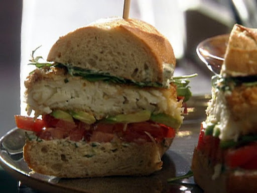 Combine lemon herb mayonnaise ingredients in a bowl and blend until well combined. Season with salt and pepper, to taste. Split the baguette in half horizontally. Open it up and toast it in a hot oven until just warmed through. Smear each half with lemon herb mayonnaise and stack up arugula, tomato and avocado on 1 half. Top with crispy panko fish fillets and top with the other half of bread. Skewer in 2 places and cut across the middle. Serve with more lemon-herb mayonnaise on the side.
