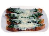 For the topping: In a large skillet, heat the oil over medium-high heat. Add the garlic and red pepper flakes and cook until the garlic is fragrant, about 30 seconds. Add 1/2 of the spinach and stir until it begins to wilt, about 2 to 3 minutes. Add the remaining spinach and cook until wilted, about 2 minutes. Season with salt, to taste. Using tongs, arrange the spinach on top of the toasts. Sprinkle with cheese and bake for 5 to 8 minutes until the cheese is melted and bubbling. Season with salt and cool for 2 minutes.