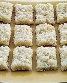 Pour coconut mixture onto prepared sheet. Spread to 1/2 inch thick using an offset spatula; shape into a 12-by-13-inch rectangle. Let cool completely on sheet on a wire rack. Cut into 1 1/2-by-2-inch bars. Store between layers of parchment in airtight containers at room temperature up to 1 week.