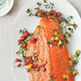 Slowly roast a trimmed, center-cut piece of salmon over a bed of herbs to infuse the flesh with fresh flavor; then bring it to the table in the pan so guests can help themselves. This dish is also good at room temperature or served cold at a picnic.