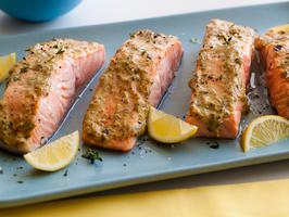 Preheat the broiler. Line a heavy rimmed baking sheet with foil. Spray the foil with nonstick spray. Arrange the salmon fillets on the baking sheet and sprinkle them with salt and pepper. Broil for 2 minutes. Spoon the mustard sauce over the fillets. Continue broiling until the fillets are just cooked through and golden brown, about 5 minutes longer.