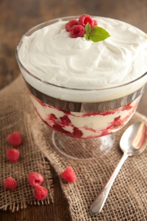 In the bottom of a trifle bowl or a 13 by 9-inch disposable aluminum foil pan, layer 1/3 of the cake cubes, 1/3 of the raspberries and 1/3 of the custard. Continue layering, ending with custard. Take the remaining whipped cream and completely cover the top of the custard. Refrigerate at least 4 hours before serving. Serve with additional whipped cream, fresh raspberries and a sprig of mint, if desired.