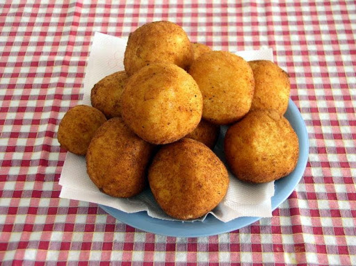 Take handful of cooled rice, flatten while forming an indent in middle of the ball. Take a teaspoon or so of cooled meat mixture and mozzarella cube and place in the indentation of rice. Take another half of handful or so of rice and finish forming the rice ball. Once all rice balls are formed, dip each into water and flour mixture (combine 1 cup of flour and 1 1/4 cups of warm water with a pinch of salt and pepper), once evenly coated in flour mixture, coat in plain bread crumbs. In a deep-fryer, fry rice balls on medium to high heat until golden brown.