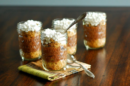 Spoon 1/2 of the graham cracker crumb mixture into the jars (I used five 8 oz. jars).