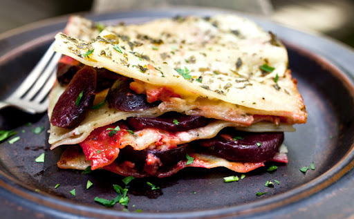 3. Preheat the oven to 350 degrees. Oil a rectangular baking dish. Spread a spoonful of béchamel over the bottom. Top with a layer of lasagna noodles. Spoon a thin layer of the béchamel over the noodles. Top with a layer of beets and sprinkle with Parmesan. Repeat the layers, ending with a layer of lasagna noodles topped with béchamel and Parmesan. Make sure the noodles are well coated with béchamel so they will be sure to soften during baking.