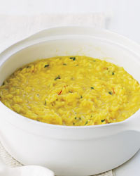 In a medium saucepan, bring the chicken stock to a simmer; keep warm. In a large saucepan, heat the olive oil. Add the onion, season with salt and pepper and cook over moderate heat, stirring, until softened, about 5 minutes. Add the rice and cook for 1 minute, stirring to thoroughly coat. Crumble the saffron into the wine and add it to the rice. Cook, stirring, until the wine is absorbed. Add 1 cup of the warm stock and cook over moderate heat, stirring constantly, until nearly absorbed. Continue adding the stock 1/2 cup at a time, stirring constantly, until it is nearly absorbed between additions. The risotto is done when the rice is al dente and suspended in a thick, creamy sauce, about 20 minutes total. Season the risotto with salt and pepper. Stir in the cheese, butter and parsley and serve immediately.