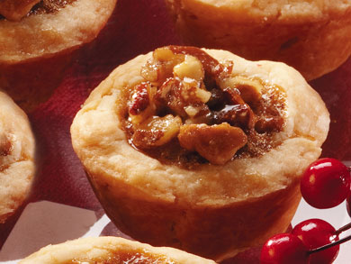 Shape chilled dough into twenty-four 1-inch balls. Place each dough ball in an ungreased mini muffin cup. Using your thumb, press dough into each cup, forming a crust. Spoon pecan mixture into crusts, filling them three-quarters full.