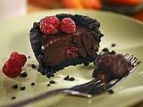 Use a fork to mix together the chocolate wafer crumbs and butter. Spray the cups of a 6-muffin tin with a vegetable spray. Line the cups with strips of parchment or waxed paper, cut so that they are as wide as the diameter of each cup and long enough to overhang the sides (you'll need this overhang to remove the tarts). Use the bottom of a small glass to press the crumbs over the bottom and sides of the muffin cups, building the sides up to only about 1 1/2 inches. Place a raspberry in the center of each crust and with a pastry bag or small plastic bag with the corner snipped off, fill the tarts with the truffle mixture. Smooth the tops and refrigerate until set, about 2 hours.