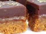 Allow the layers to come to room temperature, about 30 minutes. Using a warm, slightly wet knife, carefully cut around the edges of the chocolate layer. Release the side of the pan and remove the paper from the bottom. Cut into 1 1/2 by 1/2-inch bars and store airtight in a covered plastic container.