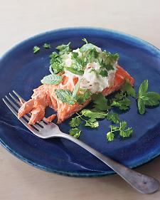 Almond-studded yogurt lends Mediterranean flair to baked salmon fillets. Showered with shallots and fresh mint, chervil, and parsley, this dish is like a party on a plate.