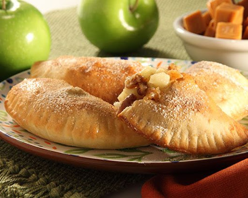 Roll out dough into a large rectangle of even thickness. Cut lengthwise into two even pieces. Cut each piece widthwise into thirds, leaving you with 6 rectangular pieces of dough. Stretch or roll out each rectangle a bit. Evenly distribute apple mixture among the centers of dough.