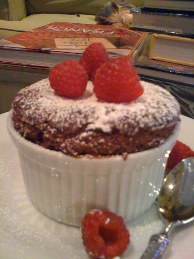 Preheat the oven to 400 degrees F. Butter 4 individual ramekins. Sprinkle each ramekin with 1 teaspoon sugar. In a large metal bowl, set over a pot of simmering water, melt the chocolate, whisking it occasionally. Remove the bowl from the heat. In a mixing bowl, whisk the egg whites with 1/4 cup of the sugar until stiff and glossy. Whisk the egg yolks into the chocolate one at a time, add the Grand Marnier, and whisk in the remaining sugar. Fold in the egg whites and blend until smooth. Pour the chocolate mixture into the prepared ramekins. Place the ramekins on a baking sheet and bake until they are puffed and somewhat firm, about 20 to 25 minutes. Remove from the oven and serve with the chocolate sauce and powdered sugar