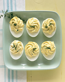 Transfer yolk mixture to a pastry bag fitted with an open-star tip (such as Ateco #825). Pipe mixture into whites, filling to 1/2 inch over surface. Garnish with herbs. Eggs can be refrigerated in an airtight container, up to 3 hours.
