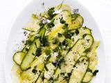 Thinly slice 1 yellow squash and 1 zucchini lengthwise (a mandoline works best); arrange a few slices on a plate in a single layer. Sprinkle with minced shallots and chopped mixed herbs, drizzle with lemon juice and olive oil, and season with salt and pepper. Repeat to make about 5 layers. Top with grated pecorino; let marinate for 20 minutes