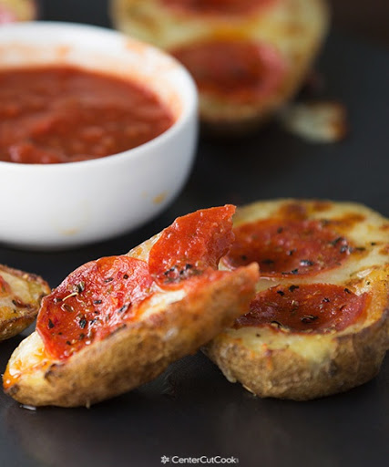 Take the potato skins out of the broiler and top with shredded mozzarella cheese and two pepperoni slices per potato skin.