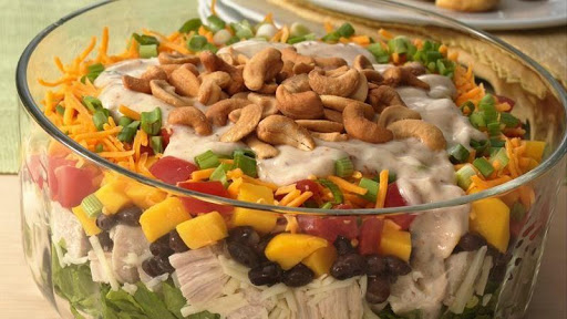 2 In 3- or 4-quart clear glass serving bowl, layer salad ingredients in order listed, except cashews. Spoon dressing evenly over salad; sprinkle cashews over top.