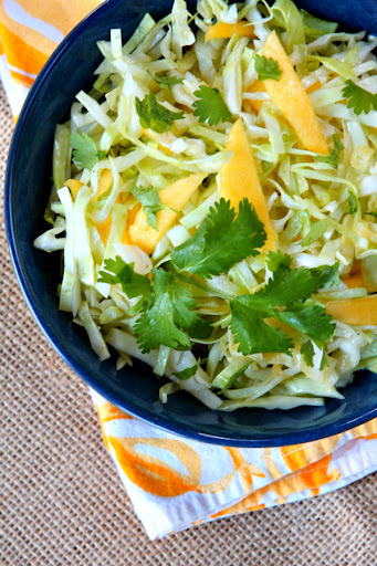 2. Place the cabbage and mango in a large bowl. Drizzle the dressing over the top and toss to combine. Add salt and pepper, to taste. Cover and refrigerate up to 4 hours before serving. Toss again just before serving to reincorporate the dressing that has sunk to the bottom of the bowl. Garnish with cilantro, if desired.