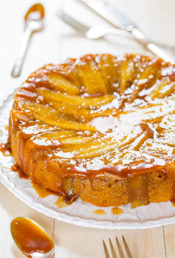 Place pan on a wire rack and allow cake to cool for at least 1 hour before inverting, slicing, and serving. Optionally before serving, drizzle with salted caramel sauce. Cake will keep airtight at room temperature for up to 5 days.