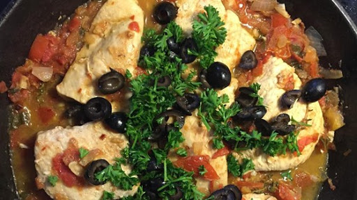 Coat chicken with flour, salt & pepper. Brown in oil. Remove. Add mushrooms, garlic, parsley & thyme. Saute until tender. Add artichoke hearts and olives. Return chicken to pan. Mix broth, tomato paste and wine. Pour over chicken and simmer covered for 40 minutes or until chicken is done.