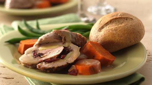 Pork is rolled around apples and cranberries in a slow-cooked recipe for two.
