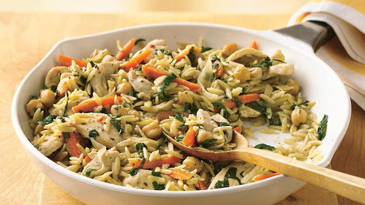 Stir in all remaining ingredients except spinach. Heat to boiling. Reduce heat; cover and simmer 12 to 15 minutes, stirring occasionally, until most of liquid is absorbed and orzo is tender.