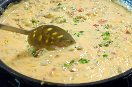 Cube Velveeta loaf. Add cubes to browned sausage and onion mixture. Add can of Rotel (juice and all), can of green chilies (juice and all), and stir over low heat.