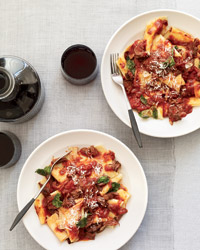 Meanwhile, in a large pot of salted boiling water, cook the pappardelle until al dente. Drain and return the pasta to the pot. Add the meat and the reduced braising liquid and cook over moderate heat, stirring, until the pasta is well coated with the brasato, about 2 minutes.
