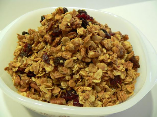 son enjoyed it. It came out very crunchy using the microwave method. The next batch I used four cups of oats and felt that it was still sweet enough. It is sweet enough that I don't think it needs any dried fruit which is nice becasue I don't always have it on hand. With the increased oats, I think I should have slightly increased the microwave time (maybe 30 to 45 seconds) to obtain the same crunchiness. I think that the first step of microwaving the dry oats helps to remove moisture from them--so don't skip this step, it's there for a reason. This is delicious and very easy to make. I will maybe cut the oil back to 1/3 cup next time and see how it turns out.