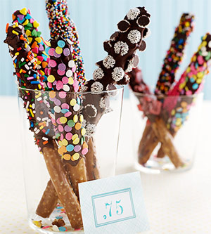 2. Ladle chocolate over 3/4 of each pretzel rod. Tap or scrape off excess chocolate, then roll pretzel in sprinkles, crushed cookies, toffee bits or mini M&Ms.