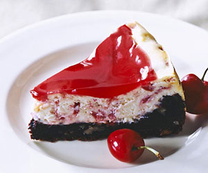 3. Rinse cherries; pat dry. Coarsely chop. In bowl, beat cream cheese and sugar until smooth. Beat in eggs, one at a time. Stir in almond extract and chopped cherries. Pour over chocolate layer; spread level to edge.