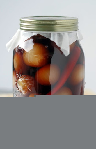 Any jars can be used but bigger is better, and a wide top makes it much easier to arrange the onions. Because the vinegar preserves the onions, sterilization is not an issue, however, it is necessary to protect metal screw top lids by putting a large circle of waxed paper or plastic wrap between the top of the jar and the lid, as any scratches in the coating on the lid with allow the metal to rust. Plastic lids or ‘Kilner’ style jars with a rubber seal and glass lid will be fine without. If the lids are missing buy ‘jam covers’ complete with greaseproof paper disks and elastic bands, they’re not ideal for long storage but they’ll do the trick short term.