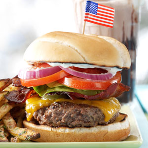 •Grill burgers, covered, over medium heat or broil 3 in. from the heat for 4-7 minutes on each side or until a thermometer reads 160° and juices run clear. Top with cheese. Grill 1 minute longer or until cheese is melted. Serve on buns with bacon and toppings of your choice. Yield: 4 servings.