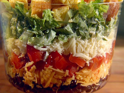 Preheat oven to 400 degrees F. Grease an 8 by 8-inch glass pan with butter. Stir together the cornbread mix with the egg and milk. Evenly spread into prepared pan and bake on the middle rack for 20 minutes. Remove from oven and cool in pan for 10 minutes. Remove from pan to cool completely. Mix together the beans with the sazon and season with salt and pepper. Toss the salsa with the tomatoes. When ready to serve, cut the cornbread into 1/2-inch croutons. Toss the lettuce with 3/4 cups of the dressing. In a clear trifle dish, layer the Tex-Mex Salad beginning with the black beans followed by the Monterey jack cheese, the tomato salsa mixture, the Cheddar, the dressed romaine and top with the cornbread croutons. Serve the remaining dressing on the side.