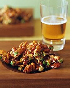 1.Line a baking sheet with a Silpat baking mat; set aside. In medium bowl, stir together the almonds, cashews, wasabi peas, sesame sticks, sesame seeds, pepper flakes, and ginger.