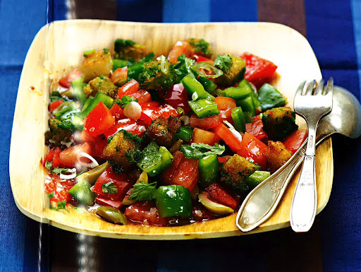 In a mixing bowl, combine the croutons, peppers, diced tomatoes, scallion, and olives and toss together. Pour in the dressing and mix well. To serve, spread the reserved tomato pulp on a serving platter and drizzle with the remaining olive oil. Top with the bread salad and season to taste with salt.