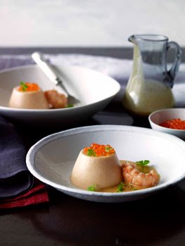 5 To serve, run a knife around sides of moulds and invert trout mousseline into shallow serving bowls, place a yabby tail beside each, pour over sauce and serve hot, scattered with salmon roe and baby parsley.