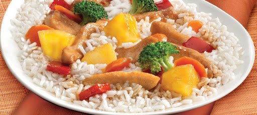 4. Heat oil in wok or large non-stick skillet over medium-high heat. Add chicken and stir fry 4 to 5 minutes or until lightly browned. Add broccoli, bell pepper, carrot and ginger; stir fry 4 minutes or until just tender. Add reserved soy sauce mixture; cook stirring, 2 to 3 minutes or until sauce boils and thickens. Stir in pineapple chunks and heat through. Serve over rice.