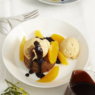 5. Kugeln aus dem Parfait stechen. Mit den Biskuits, den Orangenfilets und etwas Schokoladensauce auf Tellern anrichten.